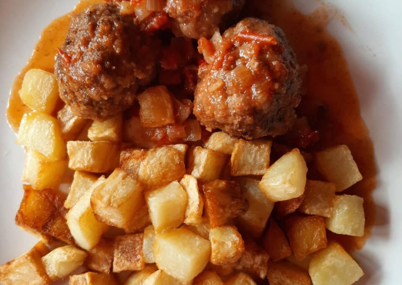 - Una vez todas doradas terminé de cocinarlas en la salsa, me salieron 50 albóndigas, sabrosas y tiernas. Las serví con papitas en cubos fritas