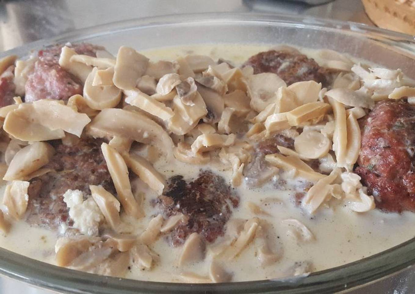 - Finalmente, sacamos las albóndigas y le agregamos en una fuente de vidrio la ricotta y la salsa de champiñones. A comer!