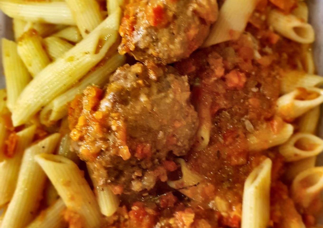 - Sacar las albóndigas y echar los mostacholes cocidos a la olla de salsa un par de minutos.
