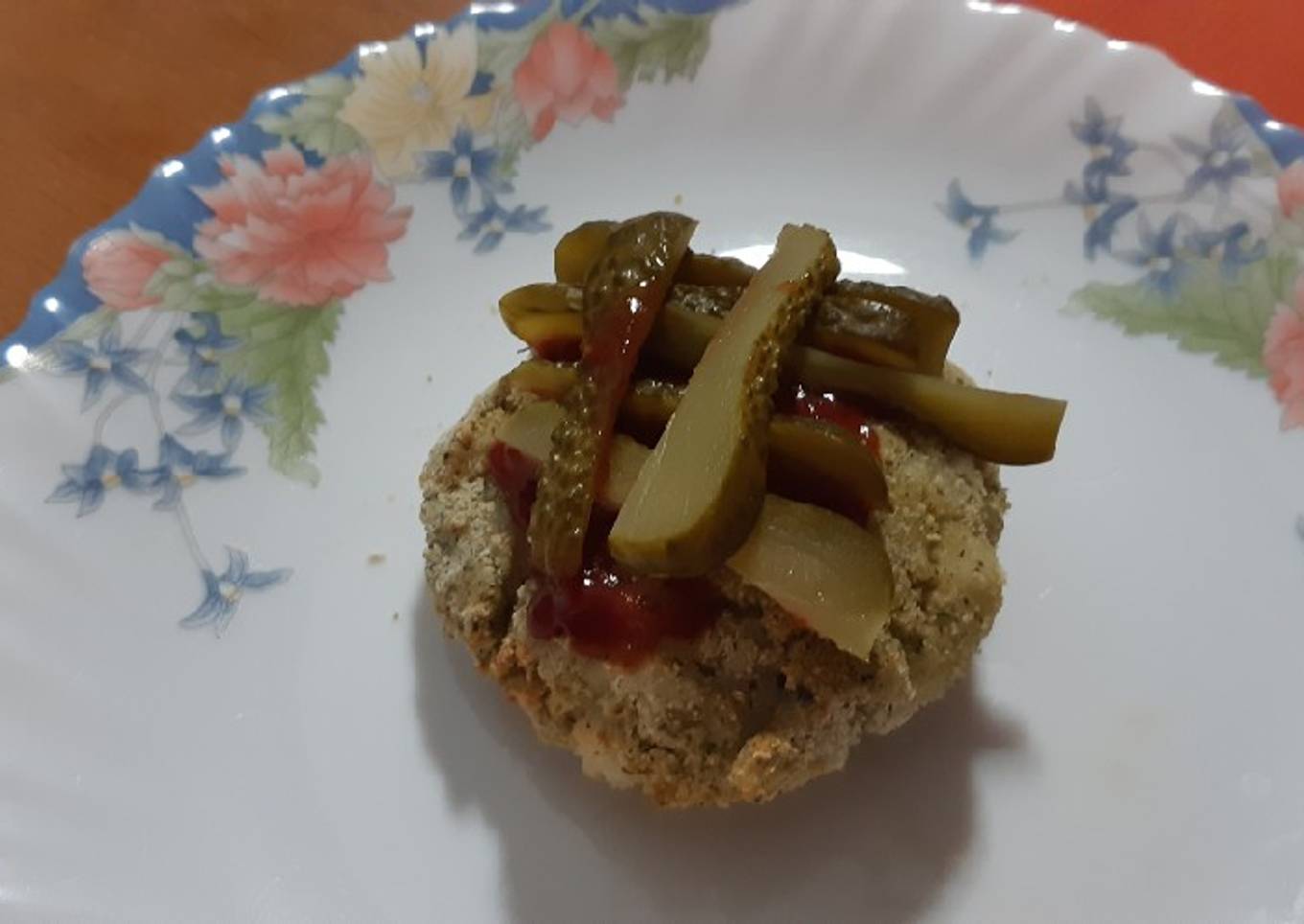 - Emplatamos, echamos el chorrito de ketchup por encima y colocamos el pepinillo partido en láminas.